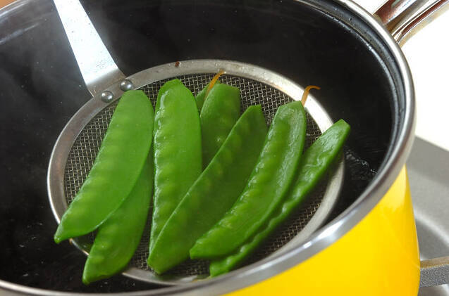 鍋に<だし汁>の材料を入れて火にかける。沸騰直前にニンジン、キヌサヤを加え、サッと煮たら引き上げる。筋を取った鶏ささ身は余熱で火を通すので、火を止め、蓋をして置いておく。