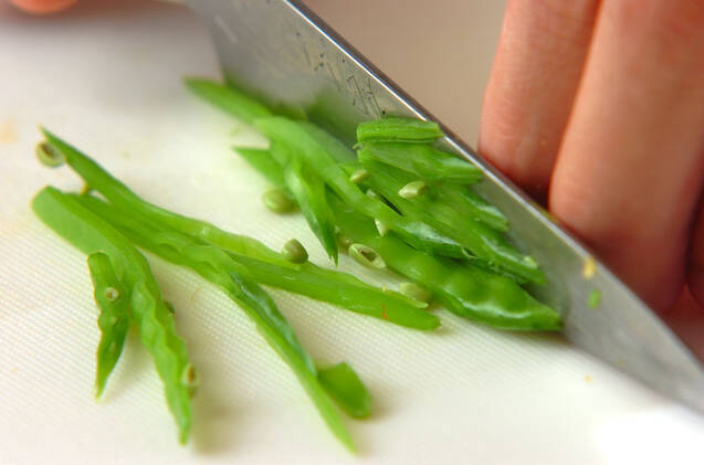 (1)のキヌサヤはせん切りにする。キヌサヤ、ニンジンそれぞれに塩少々で薄く味をつける。