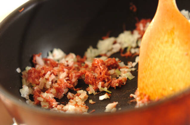 コンビーフは粗くほぐし、玉ネギはみじん切りにして、サラダ油で炒めて冷ましておく。