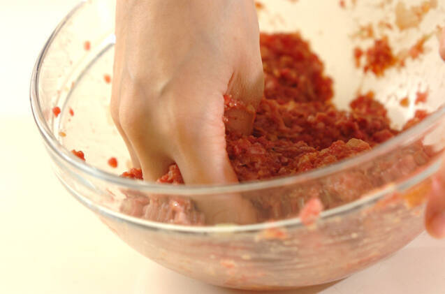 ボウルに<ハンバーグのタネ>の材料を入れ、粘りが出るまで手でよく混ぜ合わせる。