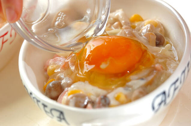 耐熱容器に(2)を入れ、2箇所をへこませて卵を割り入れる。ピザ用チーズをかけ、200℃に予熱しておいたオーブンで15~18分焼く。仕上げにドライパセリを振る。