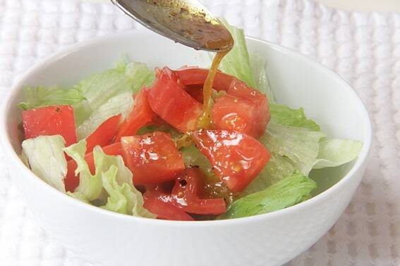 器にレタス、トマトを盛り合わせ、<ドレッシング>をかけ、細かくした卵白と卵黄を振り掛ける。