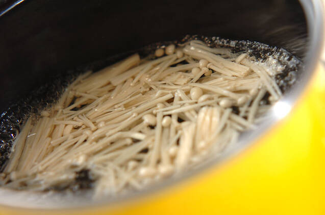 たっぷりの熱湯にエノキを入れ、サッとゆでてザルに上げ、水気をきる。