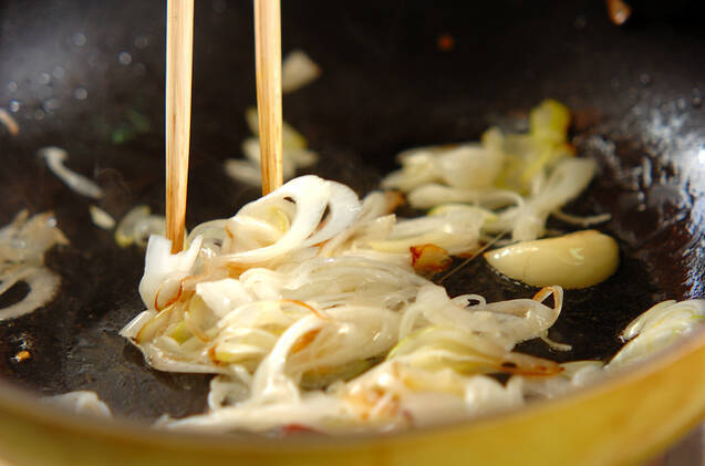 中フライパンに、オリーブ油、白ネギ、ニンニク、赤唐辛子を入れて香りがたつまで中火で炒める。