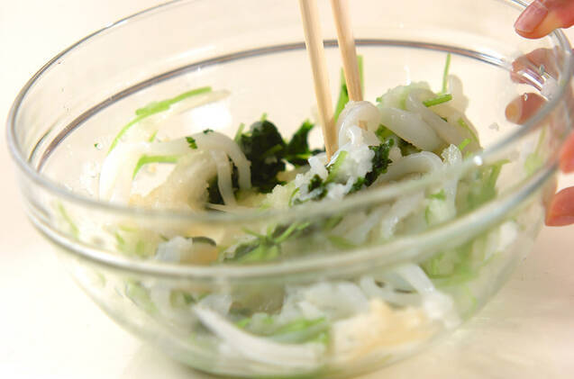 ボウルに大根おろしと作り置き甘酢、甘酢ショウガを混ぜ合わせ、イカ、ミツバを加えて和える。器に盛り分けて、お好みでしょうゆをかける。