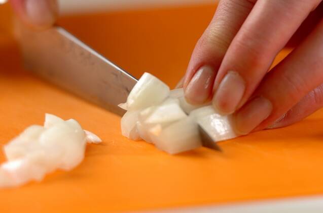 ブロッコリーは小房に分ける。玉ネギは1cmの色紙切りにする。枝豆は解凍し、サヤから枝豆を出す。