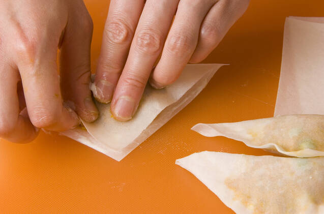 揚げ油を170℃に予熱する。3に<調味料>を加えてよく混ぜ合わせ、春巻きの皮で包み、<のり>で留める。長唐辛子は水洗いし、水気を拭き取り、揚げた時に破裂しないように切込みを入れる。
