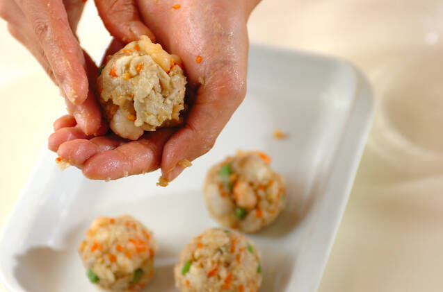 里芋に3とサヤインゲンを加え、4~6個の俵型または丸く形を整え、混ぜ合わせた<衣>をつける。形を整える時は手を水でぬらしながらすると扱いやすいですよ。揚げ油でサックリ揚げ、油をきって器に盛り、3の<あん>をかける。