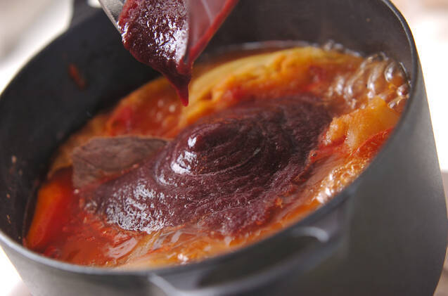 <調味料>を加え更に20分煮て、牛もも肉とビーツを加える。10分煮て塩コショウで味を調え、器に盛り分ける。サワークリームをのせてドライパセリを振る。