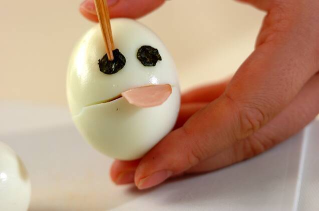 焼きのりはハサミで丸く切り、ゆで卵に張り付けて目にする。(1)のお皿に盛り付ける。
