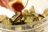 ナスはヘタを切り落として縦半分に切り、さらに幅2~3mmに切る。