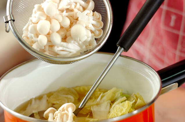 鍋に<スープ>の材料を入れて中火にかけ、固形チキンスープの素が溶けたら、白菜、ホワイトシメジを加える。