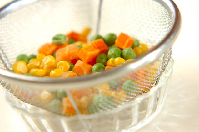 ミックスベジタブルは熱湯をかけ、ザルに上げておく。