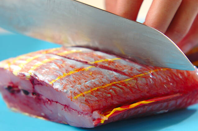 イトヨリはきれいに水洗いして水気を拭き取り、表側の身の厚い部分に切り込みを入れる。
