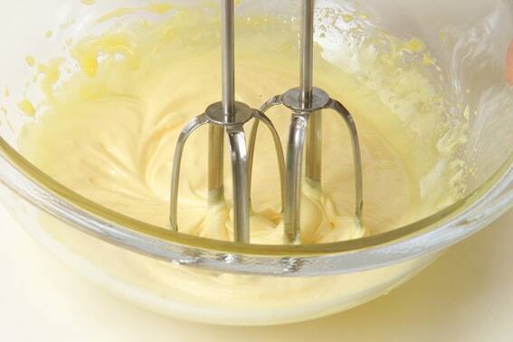 別のボウルで卵黄とグラニュー糖50gを白っぽくなるまでよく混ぜ合わせる。