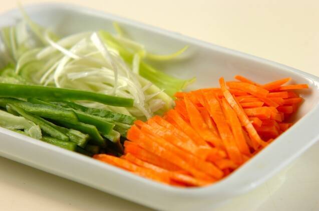 ニンジンは皮をむき、ピーマンはタテ半分に切ってヘタと種を取り、白ネギは長さを半分に切って、それぞれせん切りにする。