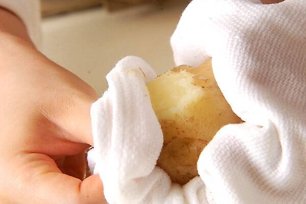 ジャガイモは皮ごときれいに水洗いする。ジャガイモはぬれたままラップでふんわり包み、電子レンジで3分加熱する。上下を返して更に3分加熱し、竹串がスッと刺されば、タオル等で包んで皮をむく。ボウルに入れ、熱いうちにマッシャーでつぶす。
