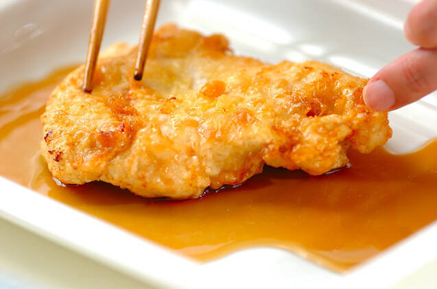 鶏むね肉に<衣>の小麦粉を薄くまぶし、溶き卵にくぐらせる。170℃の揚げ油でサクッと揚げて、油をきり<甘酢>を全体にからめる。