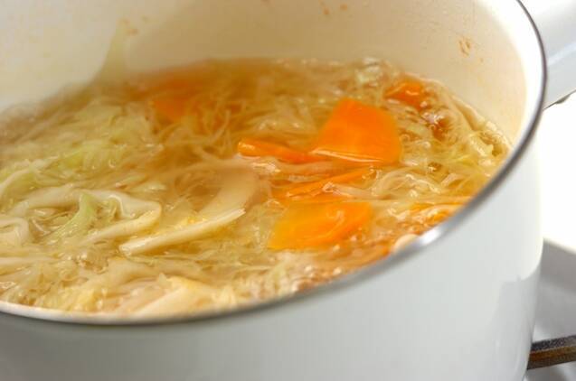 鍋に<スープ>の材料を入れて中火にかけ、煮立てばキャベツ、ニンジンを加え、しんなりするまで煮る。