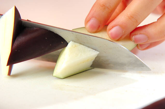 ナスはヘタを切り落として縦4等分に切り、ひとくち大の乱切りにして分量外の塩水に放つ。