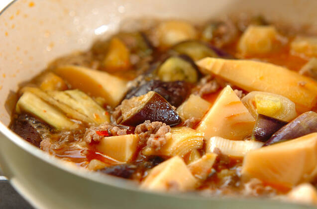 豚ひき肉の色が変わったら、水気をきったナス、水煮タケノコ、白ネギを炒め合わせ、<調味料>を加えて8~10分煮る。