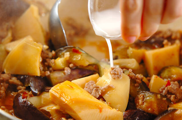 <水溶き片栗>をまわし入れ、トロミがついたらゴマ油を加え、ひと混ぜして器に盛る。