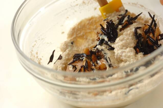 (1)にヒジキの煮物を加えて和え、器に盛る。