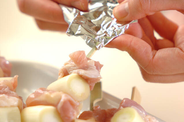 竹串に鶏もも肉、白ネギを交互に刺し、竹串の手で持つ部分にはアルミホイルを巻く。