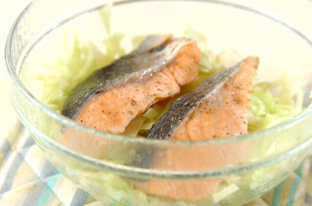 耐熱容器にキャベツを入れ、その上に鮭をのせる。ラップをかけて電子レンジで3~4分加熱する。電子レンジは600Wを使用しています。