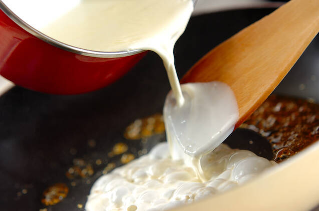 チョコレートは刻み、48℃の湯煎で溶かしておく。フッ素樹脂加工をした深めのフライパンにグラニュー糖(50g)を入れ、火にかけて木ベラで混ぜる。キャラメル色になったら、沸騰させた生クリームを少しずつ加え混ぜる。