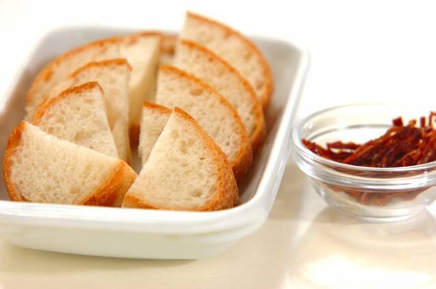 バゲットは半分に切る。ドライトマトは水でもどし、細切りにする。