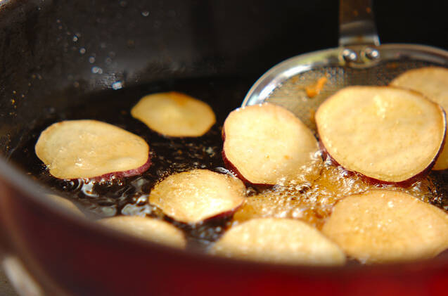 170℃の揚げ油にサツマイモを入れ、薄いキツネ色になったら、油をきって塩を振り、器に盛る。