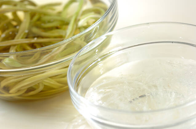 山クラゲは柔らかくもどし、水気を切って3cmの長さに切る。