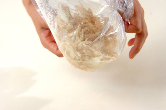 玉ネギは横半分に切ってさらに縦に薄切りにし、ビニール袋に小麦粉と五香粉と共に入れて薄く粉をからめる。