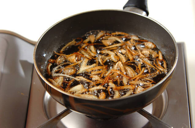 フライパンに揚げ油を160℃に熱し、(1)の玉ネギをじっくり混ぜながら揚げる。キツネ色になったら油をしっかりきる。続けてチリメンジャコもカリッとなるまで揚げ、しっかり油をきる。
