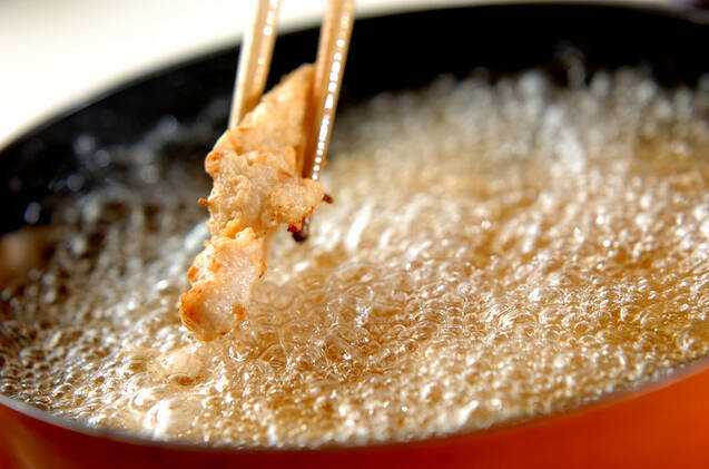 小麦粉と片栗粉を混ぜ合わせ、汁気をきった鶏ささ身をからめる。余分な粉をはたいて170℃に熱した揚げ油に入れ、サックリ揚げる。