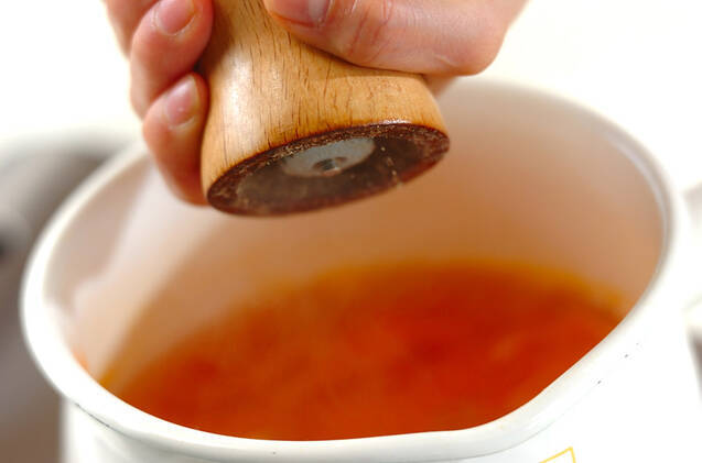 ニンジンを加えて2~3分煮、塩コショウで味を調える。器に注ぎ、ショウガ汁をたらす。