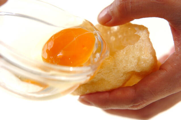 袋状にした油揚げに卵を1個ずつ入れ、油揚げの口をミツバ(2本ずつ)でしばる。