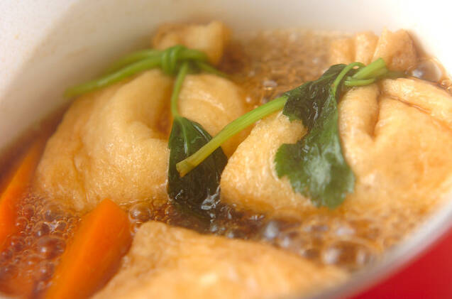 鍋に<合わせだし>の材料を入れて強火にかけ、煮立ったら(1)の油揚げ、ニンジンを加えて煮汁が1/3量になるくらいまで煮込む。水菜を加えて1分くらい煮る。水菜がしんなりしたらそのまま置き、味を含ませる。