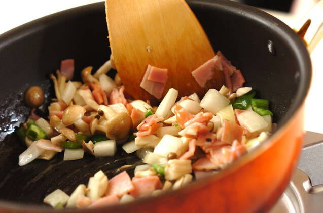 <オーブンオムレツ>を作る。フライパンにバターを熱し、玉ネギ、ベーコン、シメジ、ピーマンをしんなりするまで炒め、塩コショウをする。