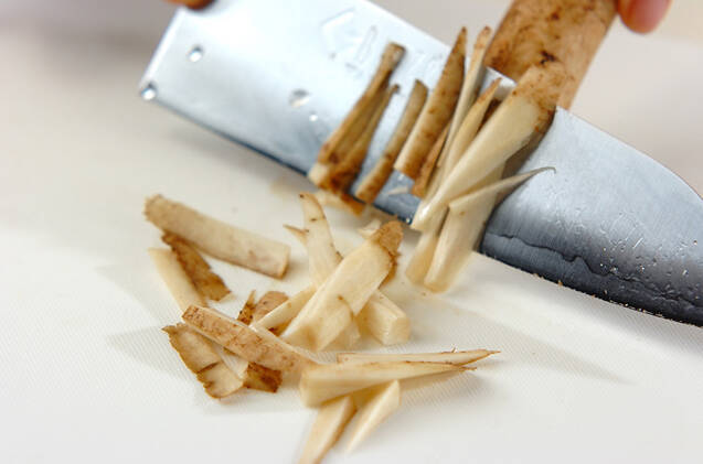 ゴボウはタワシできれいに水洗いし、太い部分は十字に切り込みを入れ、ささがきにする。水に放ってアクを抜く。