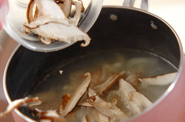鍋に<スープ>の材料を強火で熱し、煮たったら(1)を加えて3~4分煮、シイタケ、水煮タケノコを加える。