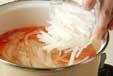 鍋に<スープ>の材料を入れて中火にかけ、煮立てば玉ネギ、ニンジン、大根を加える。