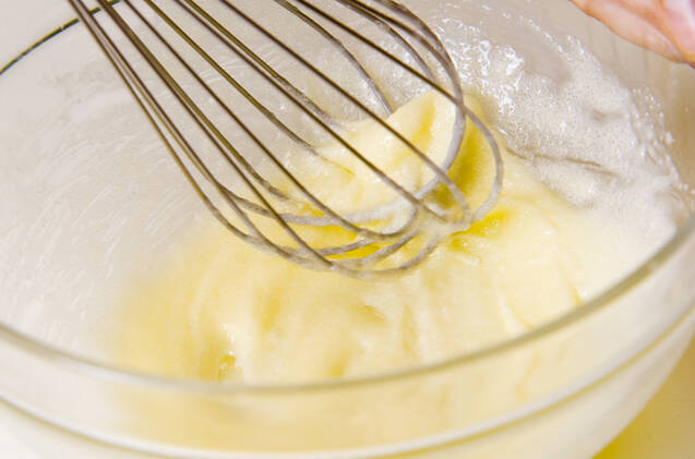 大きめの耐熱ボウルにバターを入れ、ラップをかけずに電子レンジで10~20秒加熱し、柔らかくなればグラニュー糖を加えて、泡立て器でポッテリするまで混ぜ合わせる。オーブンは190℃に温めておく。