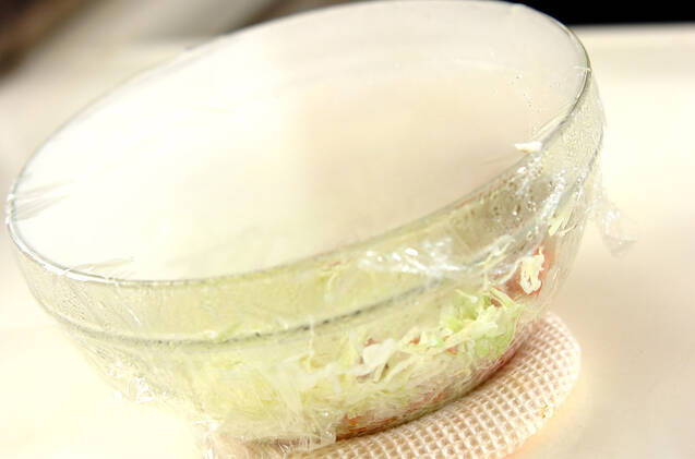 キャベツとウインナーを入れたボウルに、<調味料>の材料を加えてよく混ぜ合わせ、ラップをかけて電子レンジで2~3分加熱して、少ししんなりしたら混ぜ合わせてそのままおいておく。電子レンジは600Wを使用しています。