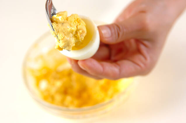 ゆで卵の黄身があったところに(1)を詰め、サラダ菜を敷いた器に盛る。お好みで白コショウを振り掛けて下さい。