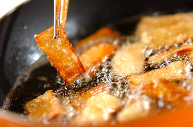 高野豆腐は片栗粉を薄くつけ、170℃の揚げ油で揚げ色がつくまで揚げ、油をきる。