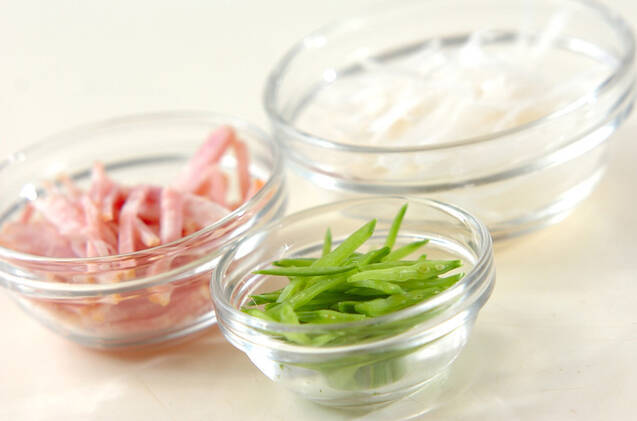 大根は皮をむいて薄い輪切りにし、さらにせん切りにする。
