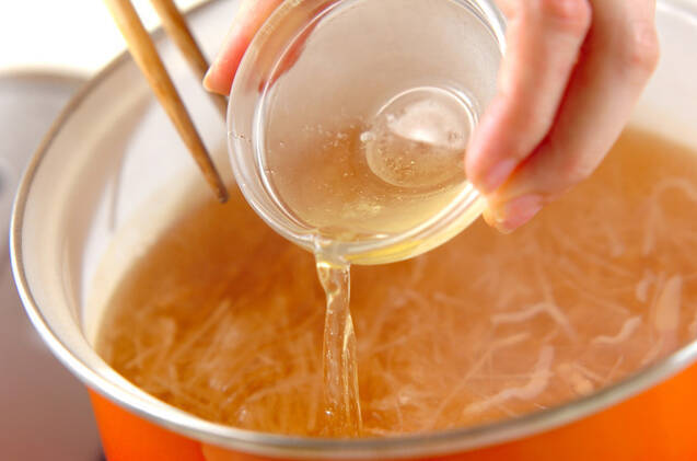 卵白を加えてふんわり浮かんできたらキヌサヤを加え、塩コショウで味を調えて器によそう。