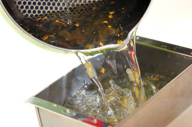 鍋底を水につけ、トロミがついてきたら金箔を加えて手早く混ぜ合わせる。流し型の内側を水でぬらして流し入れ、冷蔵庫で冷やし固める。固まったら食べやすい大きさに切り、器に盛る。(ヒント)金箔は、なければ入れなくてもOKです。